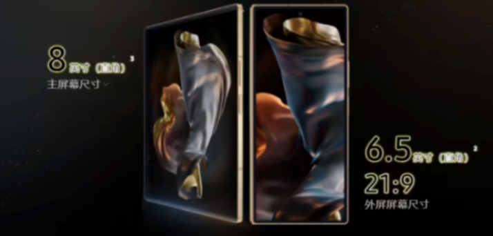 新機(jī)在展開狀態(tài)下厚度為4.9mm,折疊狀態(tài)下厚度為10.6mm,配備6.5英寸外屏和8.0英寸內(nèi)屏,峰值亮度均為2600尼特。