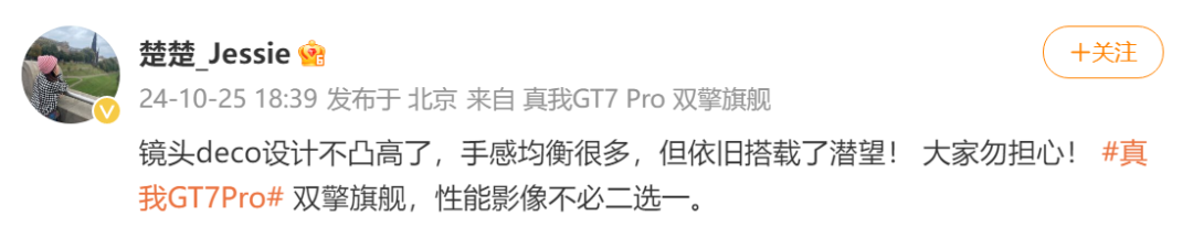 真我中國區營銷總監@楚楚_Jessie 日前發文透露,真我 GT7 Pro手機鏡頭Deco 設計不凸高,手感均衡很多,但依舊配備潛望攝像頭。