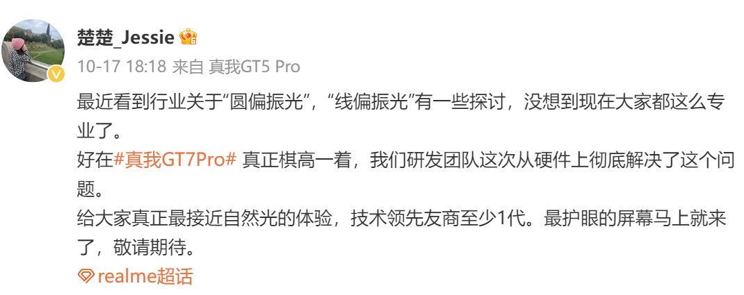 同時對于新機的屏幕表現,該營銷總監發文稱,真我GT7 Pro從硬件上徹底解決了“圓偏振光”、“線偏振光”的問題,將帶來更接近自然光的護眼屏。
