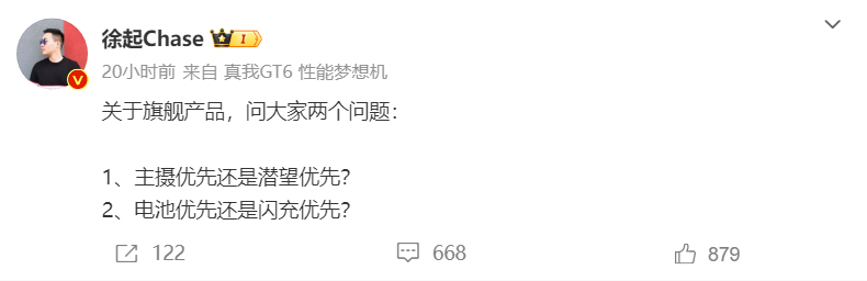 其實對于這項變動,realme真我副總裁徐起早前就發起了關于旗艦手機電池、相機配置的提問。