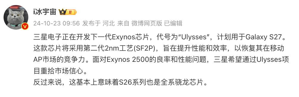 今天,博主@i冰宇宙 的最新爆料顯示:“三星電子正在開發下一代Exynos芯片,代號為“Ulysses”,計劃用于Galaxy S27。這款芯片將采用第二代2nm工藝(SF2P),旨在提升性能和效率,以恢復其在移動AP市場的競爭力。面對Exynos 2500的良率和性能問題,三星希望通過Ulysses項目重拾市場信心。反過來說,這基本上意味著S26系列也是全系驍龍芯片。”