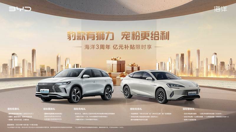 時值海洋網成立三周年,為回饋“海粉”的信賴與熱愛,海洋網推出“寵粉”大禮包,自2024年11月1日至11月30日,購買海豹07DM-i或海獅05DM-i,完成購車開票即可享至高5,000元保險補貼。貼心的鉅惠好禮配合置換補貼,“最低0首付,至高5年超長貸”,“首付50%起,24期0息”,2年免費車機流量,2年免費云服務等多重好禮,讓高品質的綠色出行體驗更加觸手可及。具體詳情,歡迎咨詢海洋網當地經銷商。