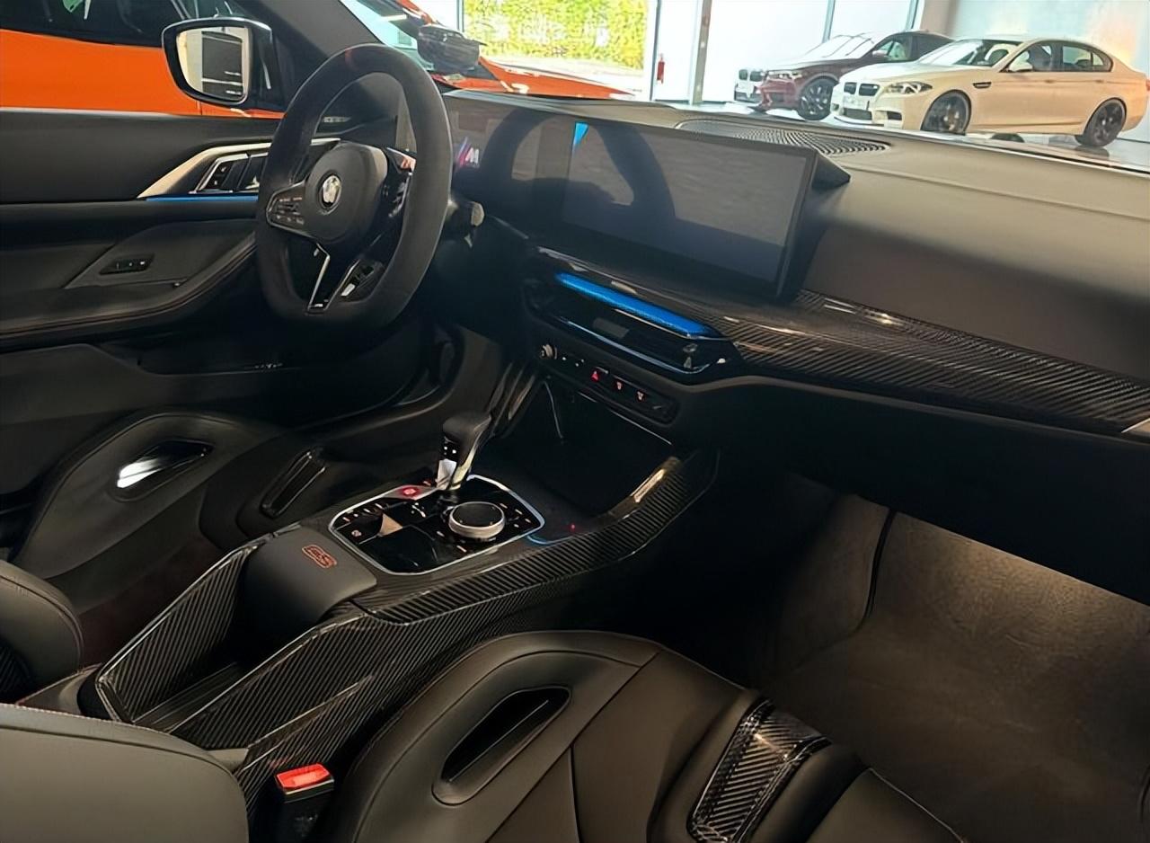 內飾依舊是全黑灰色為主,黑色為輔、還有紅色裝飾元素的點綴。車內采用了大面積淺灰色翻毛皮材質鋪陳,還加入了大量碳纖維材質的殼體,并帶有紅色的手工雙縫線設計。前排還配備了帶有掏空處理的一體式桶裝賽車座椅,三幅式多功能方向盤也加入了麂皮絨材質包裹,12點方向還有紅色回正皮標。并加入了大尺寸換擋撥片和M+、M-撥片,營造出十分戰斗的賽車風格,進一步點燃駕駛激情。中控臺依舊搭載12.3英寸和14.9英寸的曲面雙聯屏,車機升級了智能語音助理,配備了M Drive系統,可以顯示并優化行車軌跡,控制車輛的M系列設置等。