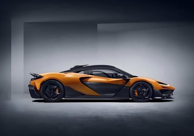 作為邁凱倫P1的繼任車型,邁凱倫W1也采用了經典的橙色涂裝,與黑色碳纖維的經典交替搭配,也算是一種經典的傳承。前臉的造型依舊十分科幻。整個前臉十分寬扁,前艙蓋兩側的線條向中心收攏,前風擋玻璃兩側加入了左右對稱式的導流槽,往里的位置還有兩側柳葉狀的散熱孔,周圍還有黑色碳纖維裝飾,與前方大尺寸梯形鏤空,形成了“微笑”的姿態。低趴的車頭層次感豐富,修長的大燈組造型非常犀利,點亮后的科技感更強。前保險杠層次感豐富,主動式擾流翼片由兩個電動機驅動,能夠實現弧形擺動,從而在車身前部創造出一個貫穿式通道,以進一步提升空氣動力學表現。