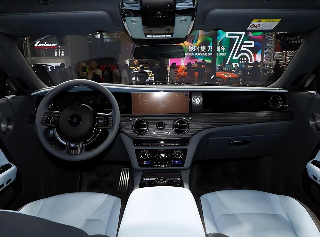 內飾依舊是勞斯萊斯家族式設計風格,中控臺配備了經典的三輻式多功能方向盤、內嵌式彩色液晶儀表、中控液晶顯示屏、副駕駛多媒體大屏。車頂配備了無數顆射燈的星空車頂棚,門板內側也加入無數顆射燈,如同璀璨的銀河一般,配合著迎賓燈、車內氛圍燈,還有可以自動升起的飛天女神車標,氛圍感直接拉滿。大面積詩米安高檔真皮材質的鋪陳,還有手工刺繡,銀質的裝飾面板,視覺效果更加高級,觸感也是頂級豪車該有的樣子。新車使用海軍藍、白色和芍藥粉三色搭配,內提供了4座布局,配備的真皮沙發座椅,支持加熱/通風/按摩功能,前后排都自帶扶手箱。特氟綸材質雨傘、音響(600瓦10聲道功放和16個揚聲器)、Cullinana時鐘、360度全景影像,應有盡有,極盡奢華。