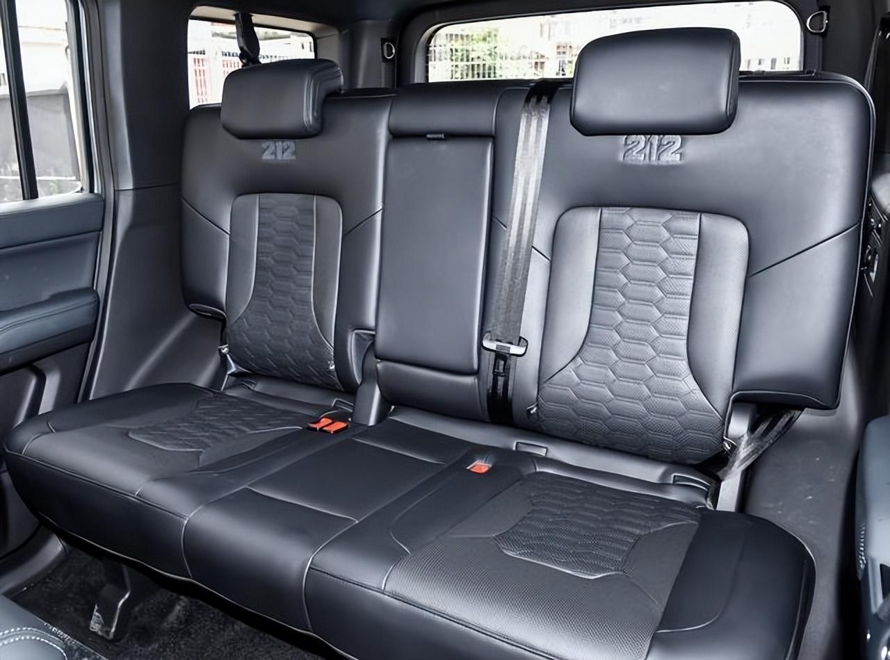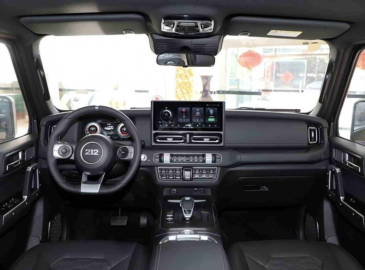 動力方面,212 T01搭載2.0T發動機,最大功率為185千瓦,最大馬力252匹,峰值扭矩410牛米,傳動系統匹配縱置8AT變速箱,最關鍵的是該車可以加92號汽油。車身采用了非承載式結構,并采用了五連桿式非獨立懸架并搭載分時四驅系統,包括高速四驅和低速四驅的切換,還提供有OFF ROAD模式、陡坡緩降、前/后兩把差速鎖以及可斷開防傾桿等,越野能力不容小覷。也配備了電子擋桿和電子手剎。
