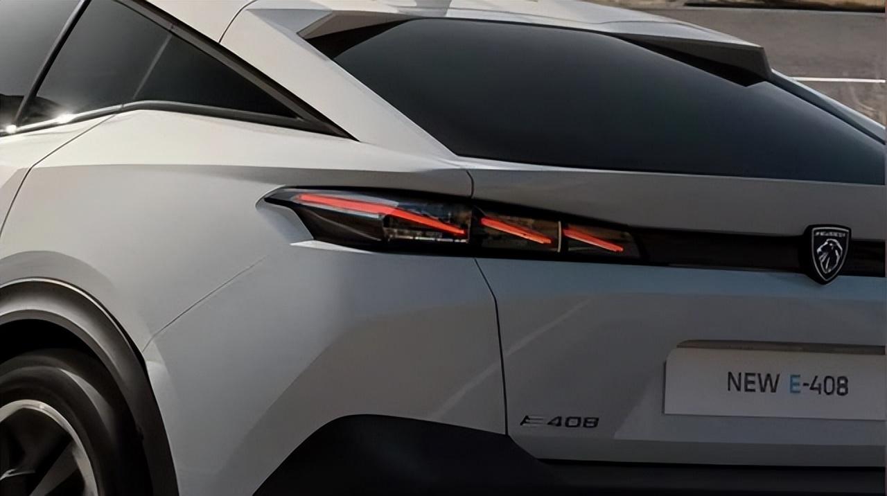 車尾也采用了掀背式的設計,與國內408X有著異曲同工之妙,但是在細節處會與燃油版車型有所不同。十分另類的后尾翼搭配著腰線延伸出來的擾流板,貫穿式的黑色裝飾面板也更加符合時代潮流,點亮后采用了全新的三個斜杠的樣式,中間的部分是不發光的。同時車輛尾部有E408的標識。后保險杠也運用了黑色碳纖維材質、亮銀色鍍鉻裝飾,層次感豐富。