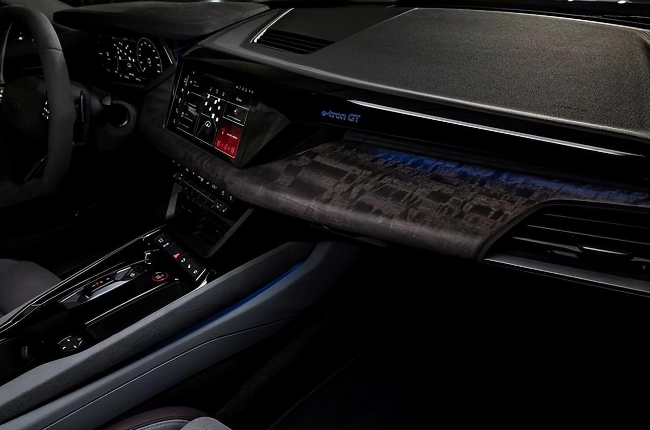 奧迪RS e-tron GT限量版車型的內飾布局與普通版車型基本一致,只不過在用料材質上會更加高級,大面積淺灰色麂皮材質的鋪陳,還有大理石紋理的碳纖維裝飾面板以及可以看到碳纖維編織紋路的干碳裝飾面板鋪陳,還有深灰色磨砂材質的金屬裝飾元素點綴,中控臺以及門板四周加入了亮黑色鋼琴烤漆裝飾面板和醒目的藍色可發(fā)光的RS e-tron GT徽標,再配上環(huán)繞四周的氛圍燈設計,營造出更加濃郁賽車氛圍。