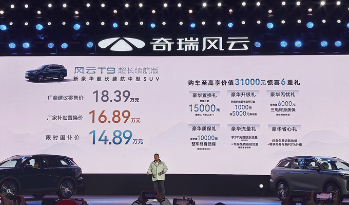 2024年11月18日,奇瑞插電混動中型SUV風云T9超長續航版在天津正式上車,新車官方指導價為18.39萬元,現在購車可享廠家提供的1.5萬元置換補貼,以及限時國家補貼,補貼后最終起售價為14.98萬元。此次改款,風云T9長續航版主要更新了混動系統的純電續航能力,CLTC純電續航從之前的120km提升到210km。伴隨新車而來的,還有豐富的購車權益。