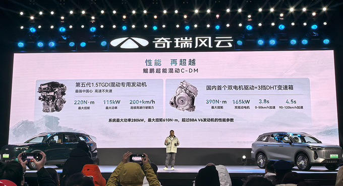 動力方面,風云T9超長續航版搭載了奇瑞鯤鵬超能混動C-DM系統,該系統由一臺1.5T混動專用發動機和電動機組成,綜合功率可達280kw,峰值扭矩為610N·m,從容應付各種情況對動力系統的要求。除此之外,風云T9超長續航版還配備了三檔DHT變速箱,CLTC純電續航可達210km,綜合續航能力超過2000km,是一款能油能電,能跑遠路的高能SUV。