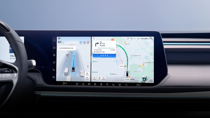 車機方面,配備10.25英寸全液晶組合儀表+14.96英寸懸浮觸摸式中控屏+高通SA8155P車規級座艙芯片。搭載最新的天璣系統XOS可實現:XDock自定義任務欄、3D UI人車交互、分屏多任務、前后排四音區交互,而且可以實現本地對話(無網可用)以及多語言對話、連續對話、并行指令。而我們常用的導航可以實現,離線導航/無縫導航(車機手機互聯互通)以及車道級導航。
