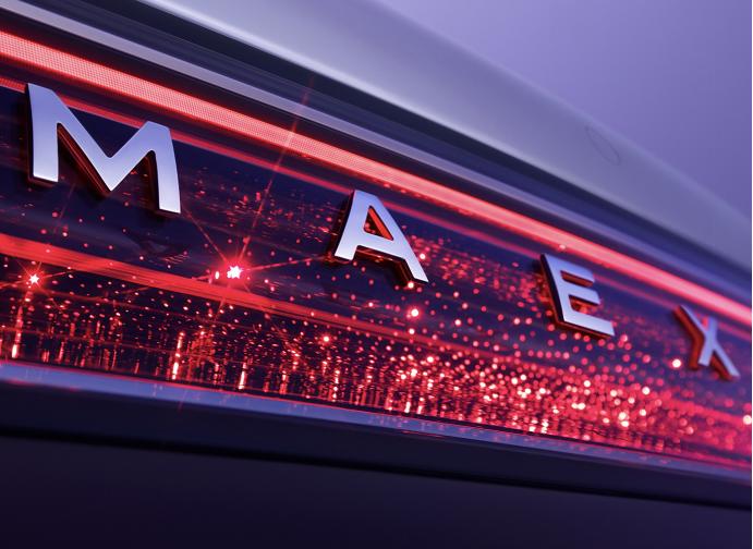 車尾部分簡潔大氣。采用貫穿式尾燈,內(nèi)部加入大量點(diǎn)狀式光源,呈現(xiàn)出星光效果。尾燈中央帶有“MAEXTRO”英文標(biāo)識(shí)。后包圍處配有反光條。
