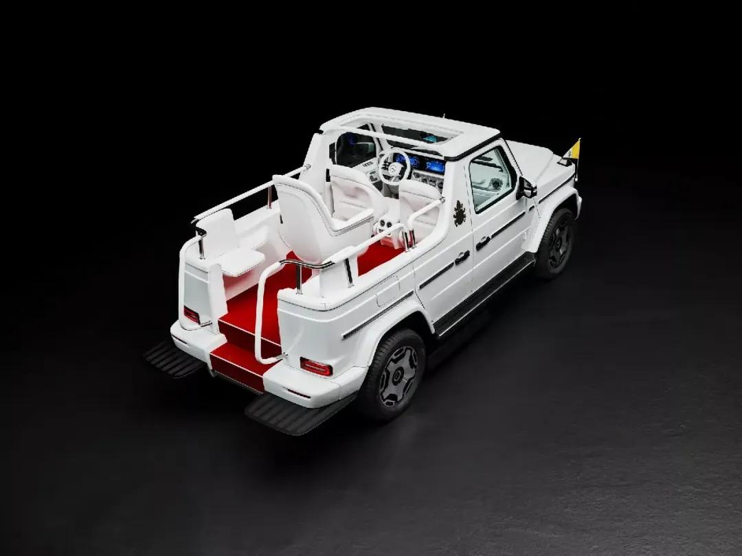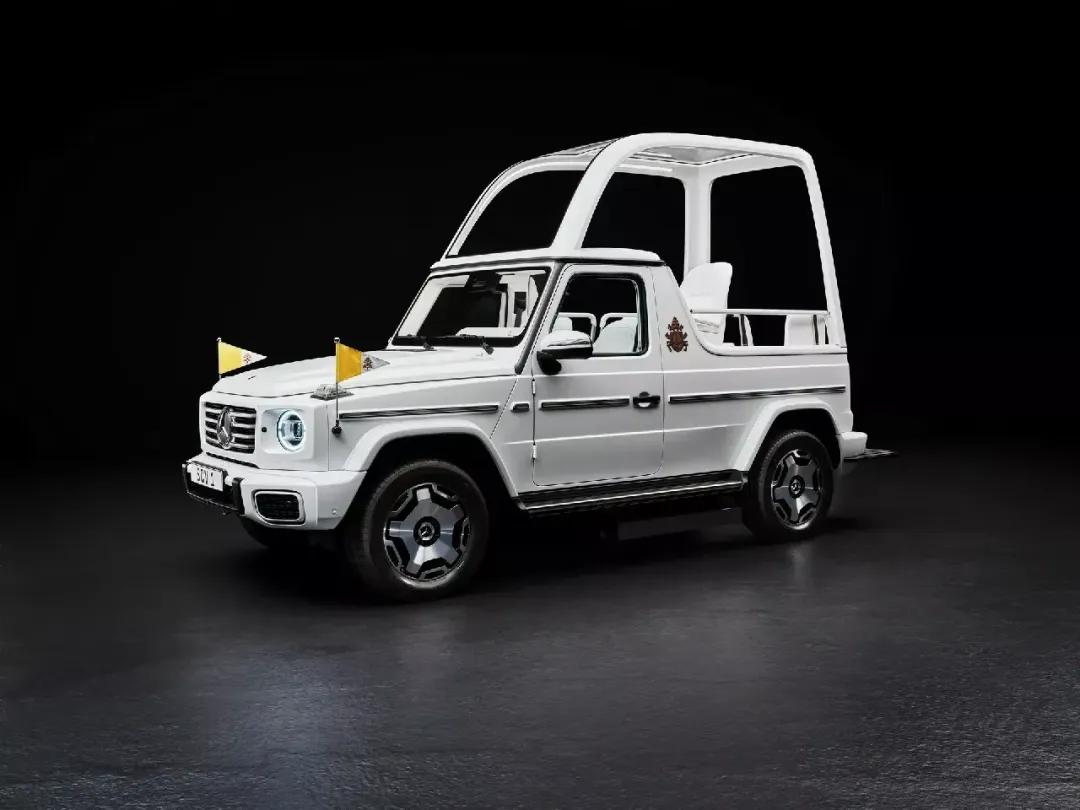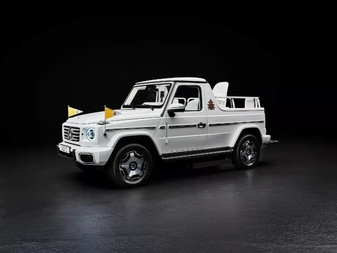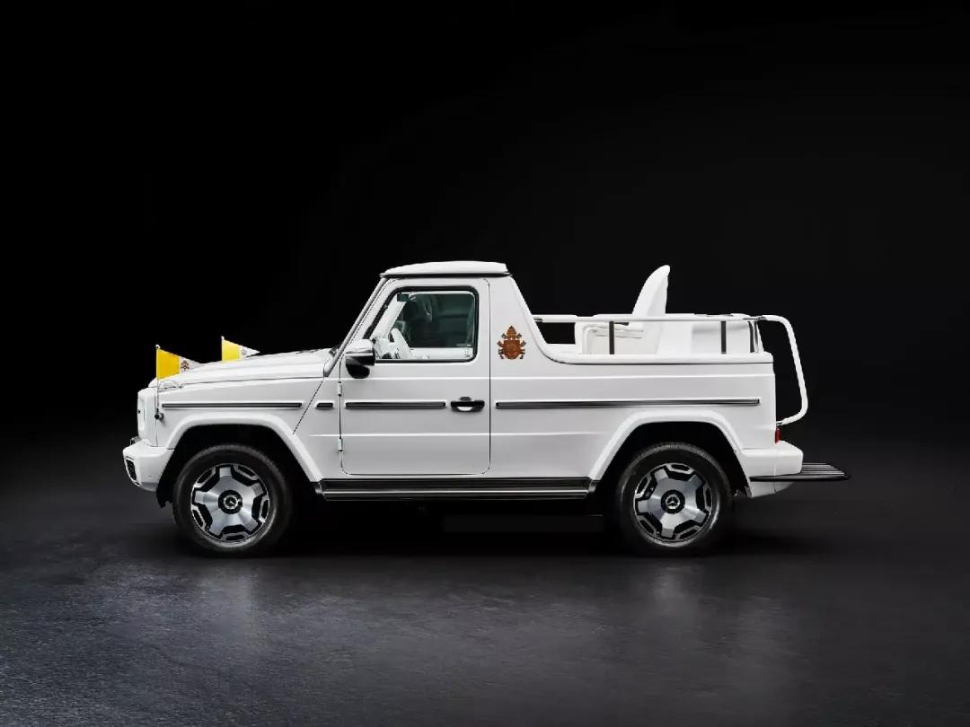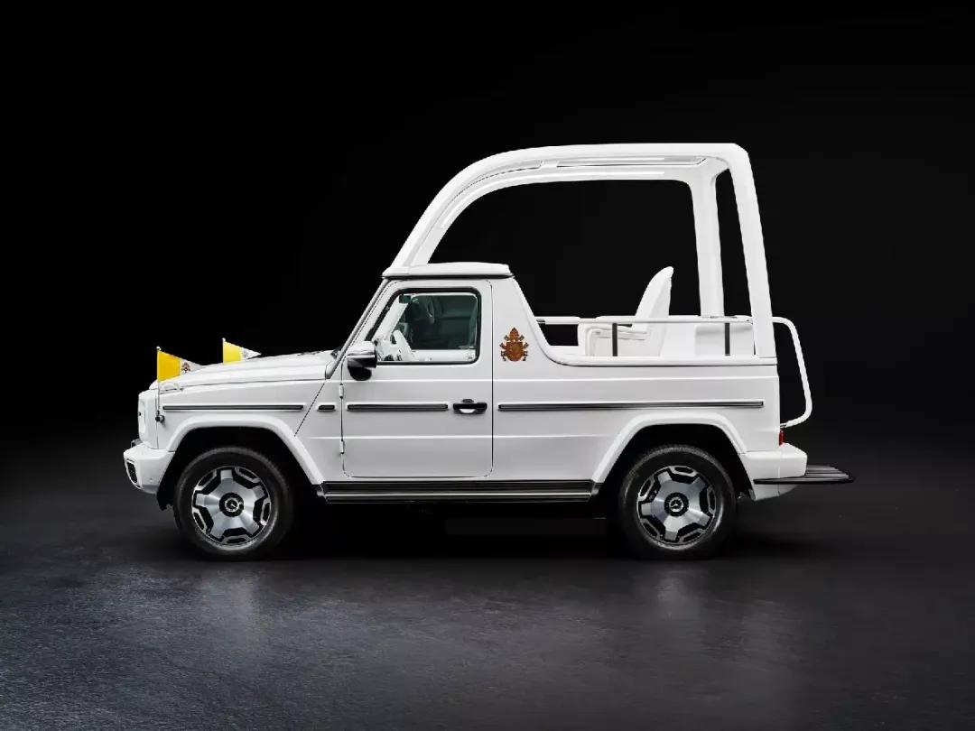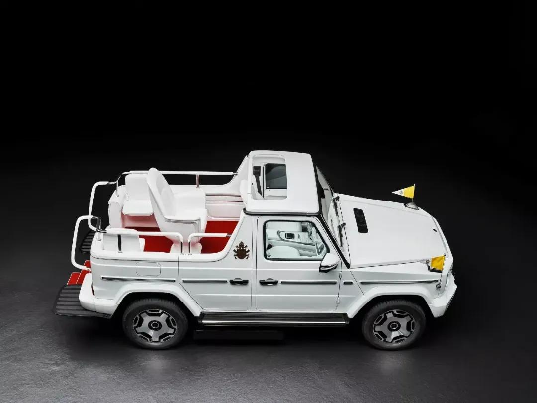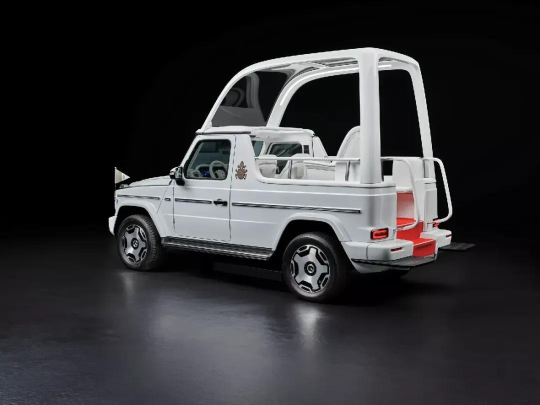 這款僅此一輛的“專G”是奔馳與梵蒂岡密切合作開發的,采用珍珠白外觀和敞篷設計,并且進行了深度改裝。奔馳表示,左車門被拆除,并且“無縫焊接到車身外殼中”,雖然右后門依然保留,但被改裝成了對開形式。