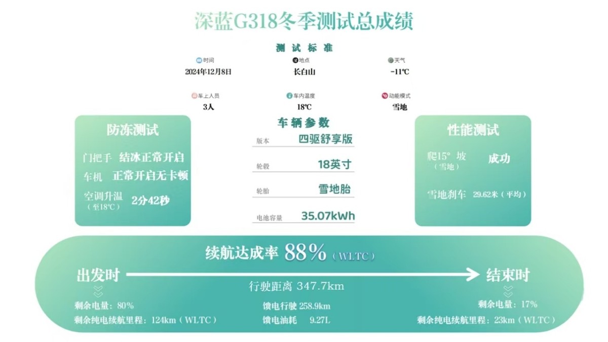 不難發現,深藍G318在本次冬季測試中,展現出了不俗的“熱管理”實力,同時,在極寒環境下,能耗方面同樣較為出色。當然,駕控表現也會是深藍G318的加分項。可見,深藍G318在技術方面的成熟與可靠性,解決了消費者冬季用車痛點,讓用車更放心。