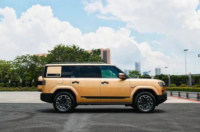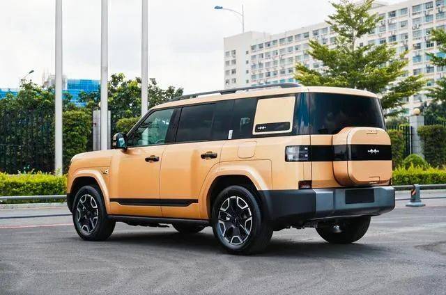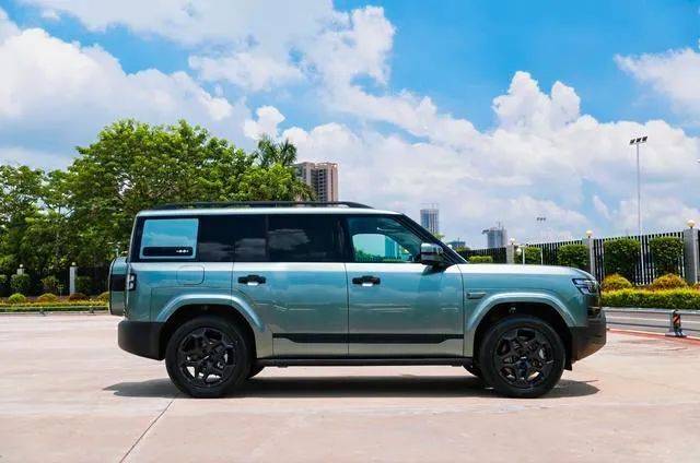 來到車身側面,方正的硬派造型,車身頂部配備行李架,在D柱處更是鑲嵌著方程豹標識。配備傳統的機械式門把手,搭配粗壯的腰線,外擴的輪眉,并采用兩種樣式的輪圈,提供235/50 R19、245/50 R19、255/40 R21三種輪胎規格。